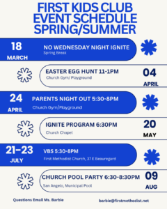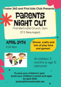 Kiddos 2 1/2 through 5th grade are invited to join us weekly for Bible lessons, games, crafts, and fun! The nursery is open for babies 6 weeks to 2 years. No sign up needed. Drop off/pick up is on the 2nd floor Children’s Area.